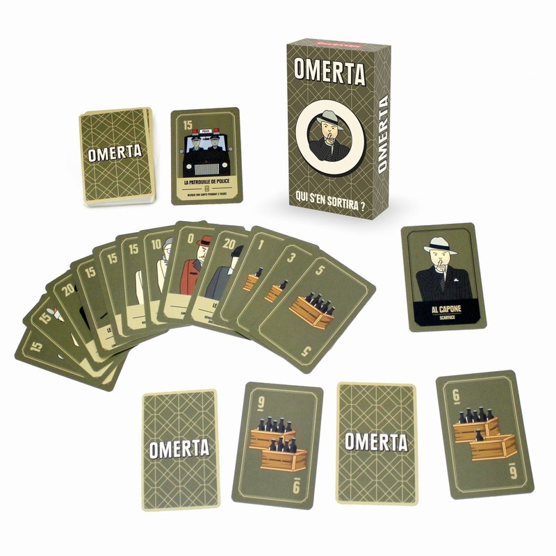 Chaque joueur a devant lui 4 cartes posées face cachée, et ne prend connaissance que de 2 dentre elles... Alcool ou personnage, quas-tu devant toi et à quelle place ? A ton tour, pioche une carte sur la pioche ou la défausse et remplace une carte de ton jeu par celle-ci. Il faudra être attentif et savoir jouer de ta chance pour réussir à réunir moins de 7 points devant toi ! Certaines cartes peuvent te rendre service, mais aussi te coûter des points... Si tu es sûr de toi, crie « Omerta »... Mais gare à toi si tu tes trompé !