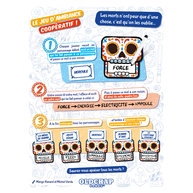 Chaque joueur reçoit un personnage mort (qu’il garde secret) et écrit, sur son ardoise Crâne, un mot qui lui fait penser à ce personnage. Ensuite, les joueurs font passer à leur voisin de gauche leur ardoise Crâne. Ce dernier va lire le mot, l’effacer et écrire sur l’ardoise Crâne un autre mot qui lui fait penser au mot qu’il a reçu. Puis il va passer le Crâne à son voisin de gauche qui va faire de même... Et ainsi de suite, pendant 4 tours : l’information va donc se déformer ! À la fin de la partie, tentez d'associer chaque personnage à son Crâne.