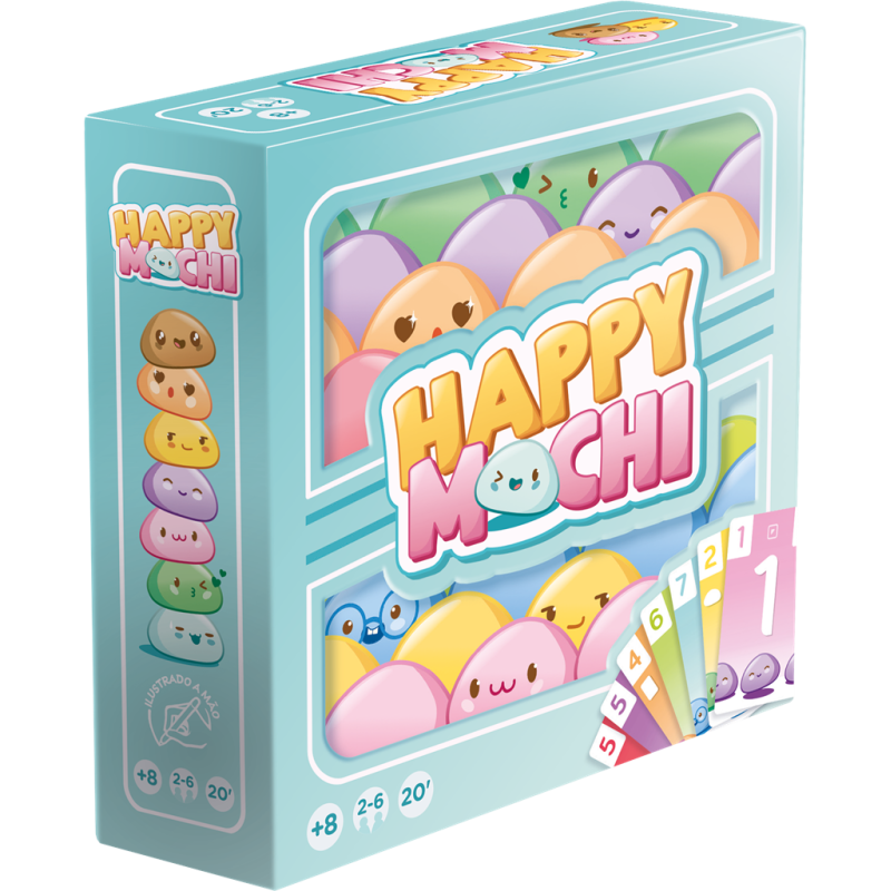 Dans Happy Mochi, vous recevez 7 cartes que vous ne pouvez pas classer ! À votre tour, piochez une carte ou jouez un duo. Pour ce faire, prenez deux cartes ADJACENTES dans votre main pour recouvrir le duo central, en respectant les contraintes de valeur (inférieure ou supérieure) et de couleur. Si vous jouez deux cartes de même valeur, c’est un Happy Mochi, ne tenez pas compte des contraintes ! Une fois un duo joué, appliquez ses effets éventuels : tourner la carte Sens, faire piocher, passer une carte à son voisin, ou mettre une carte en réserve.