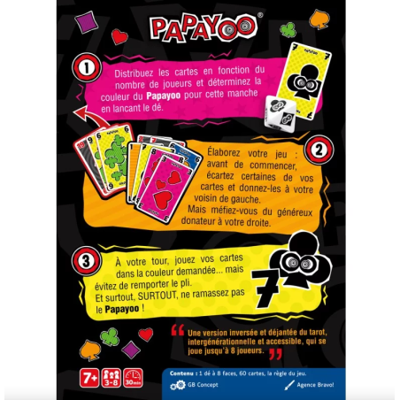 Dans ce jeu de cartes, il n’y a ni valets, ni reines, ni rois, mais une cinquième couleur, dite Payoo, plus un drôle de dé. Comment marquer le moins de points possible ? En évitant de récolter ces fichus Payoos et surtout le Papayoo, ce satané 7 dont la couleur change (maudit dé !) à chaque manche… Vous n’êtes pas satisfait de la donne ? Pas grave, vous donnez des cartes à votre gauche avant de commencer. Mais faites les bons choix, car elles seront remplacées par le « cadeau » venant de droite… Ensuite vous jouez la donne mais sans atouts et sans scrupules, pas sûr que le meilleur gagne !