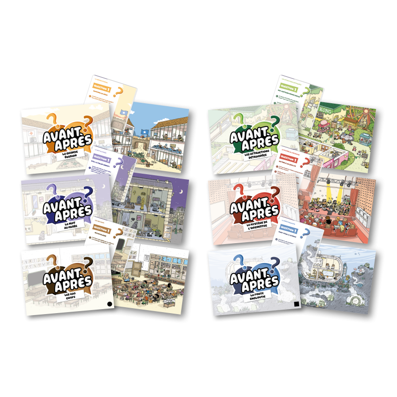 l’illustration « Avant » et l’autre reçoit l’illustration « Après » mais vous ne savez pas qui a reçu quelle illustration. Comprenez ensemble tout ce qui s’est passé entre vos deux scènes... sans jamais montrer votre illustration à l’autre groupe ! Décrivez tous les détails, prenez votre temps, et écoutez bien les autres pour répondre aux questions du livret.