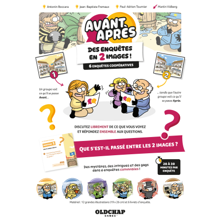 Le jeu d'enquête en deux images ! Dans ce jeu coopératif, une partie des joueurs voit l’illustration d’une scène se déroulant Avant, tandis que l’autre partie des joueurs voit la scène se déroulant Après. Communiquez ensemble afin de comprendre tout ce qui s’est passé entre les deux illustrations.