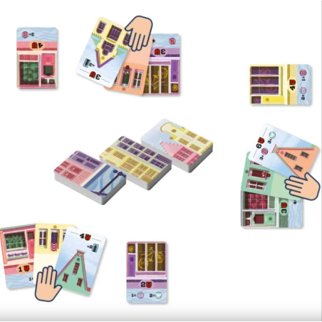 Choisissez la meilleure carte de votre main à poser avant de les passer à vos adversaires. Vous devrez réaliser les objectifs de vos Boutiques et de vos Toits, tout en gardant un œil sur les couleurs afin de marquer le plus de points et de remporter la victoire !