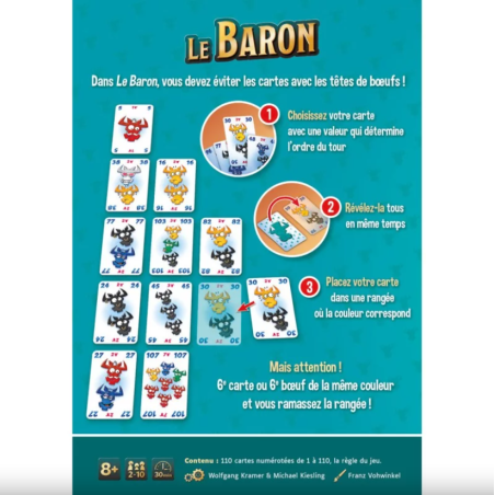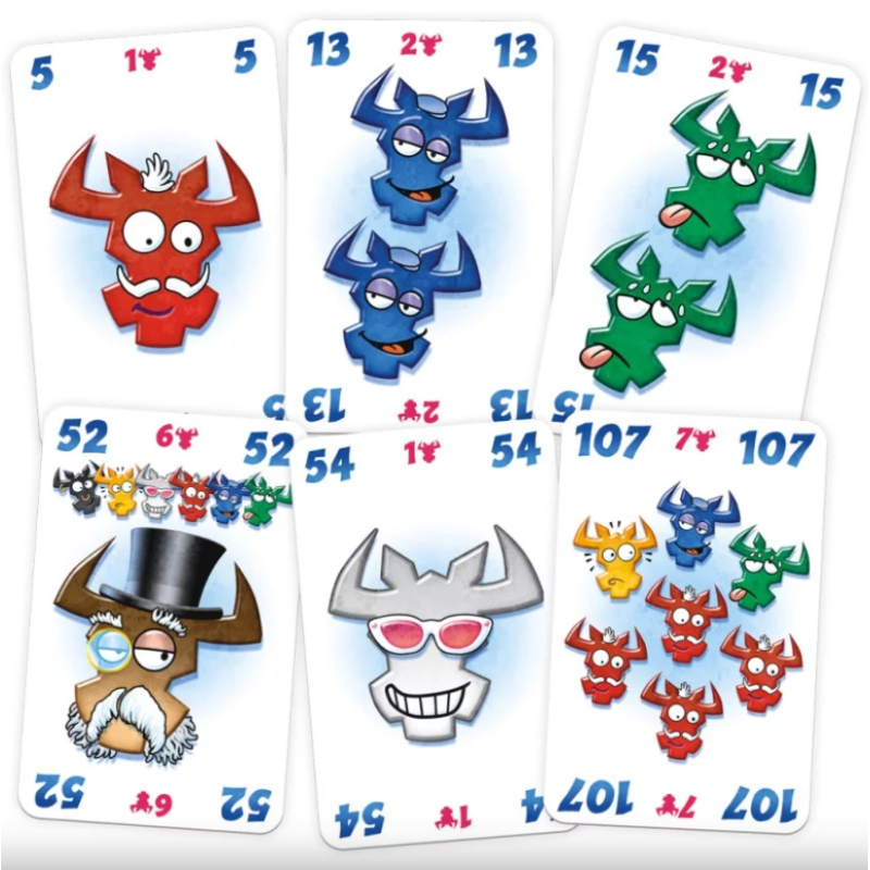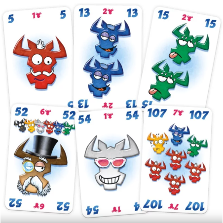 Posez vos cartes dans une des 5 rangées en respectant les couleurs des têtes de bœuf disponibles. Mais attention : si vous posez la 6e carte ou la 6e tête de bœuf de la même couleur d’une rangée, vous devez ramasser les cartes ! Vous récupérez ainsi des points négatifs. Alors arrangez-vous plutôt pour forcer vos adversaires à les ramasser et ainsi peut-être remporter la victoire !