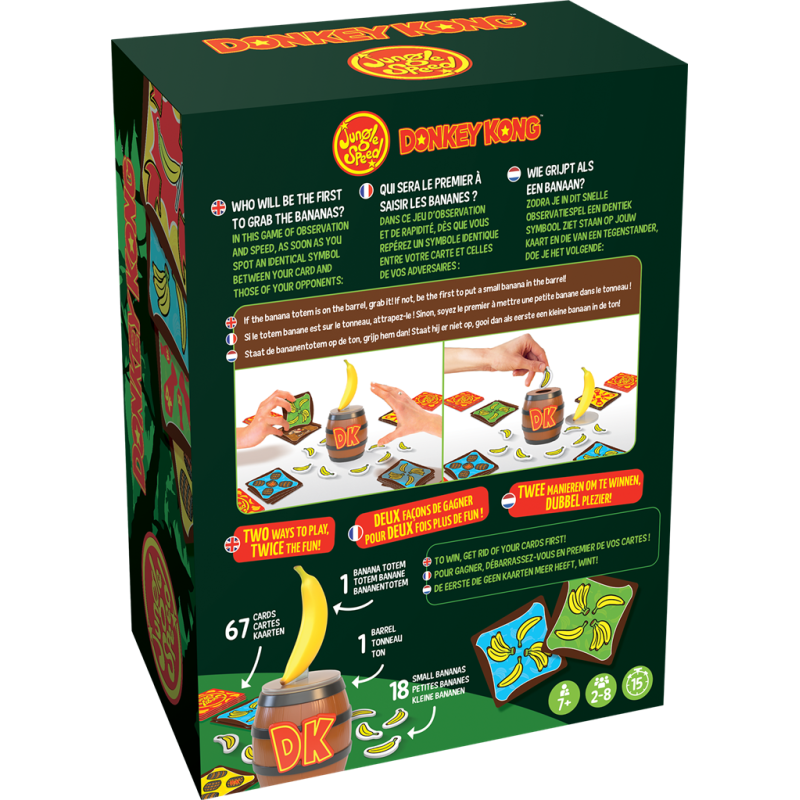 Jungle Speed est un jeu combinant rapidité et observation. Chaque joueur retourne, à son tour, une carte de son paquet. Si deux cartes identiques se retrouvent ainsi visibles, jetez-vous le premier sur la banane ou ramassez une petite banane et mettez-la dans le tonneau. Mais attention ! Il y a des pièges et les illustrations de certaines cartes sont trompeuses. Ouvrez l’œil pour ne pas vous faire piéger pour ne pas récupérer un max de cartes ! Soyez le premier à ne plus en avoir pour être le champion.