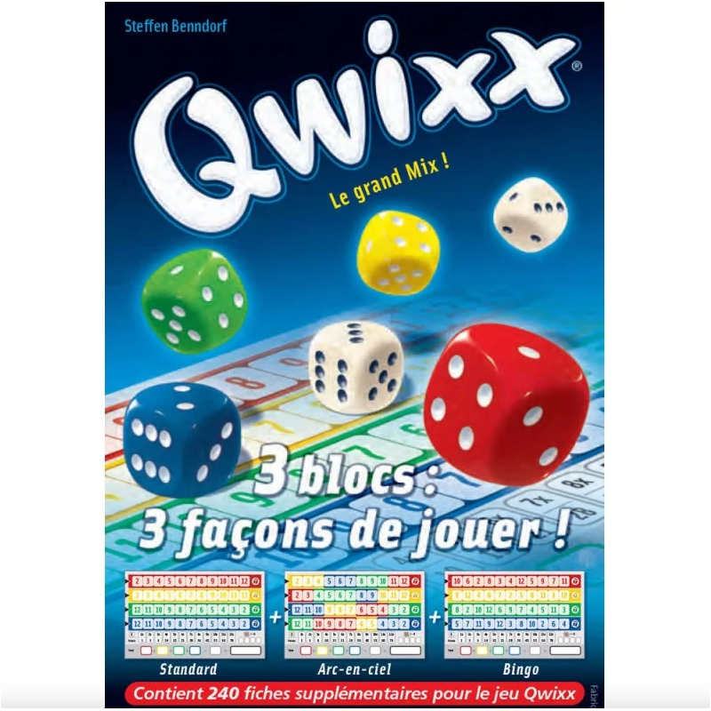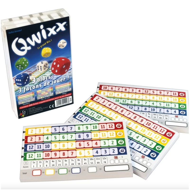 Le pack contient 3 blocs supplémentaires pour le jeu Qwixx : un standard, et 2 variantes