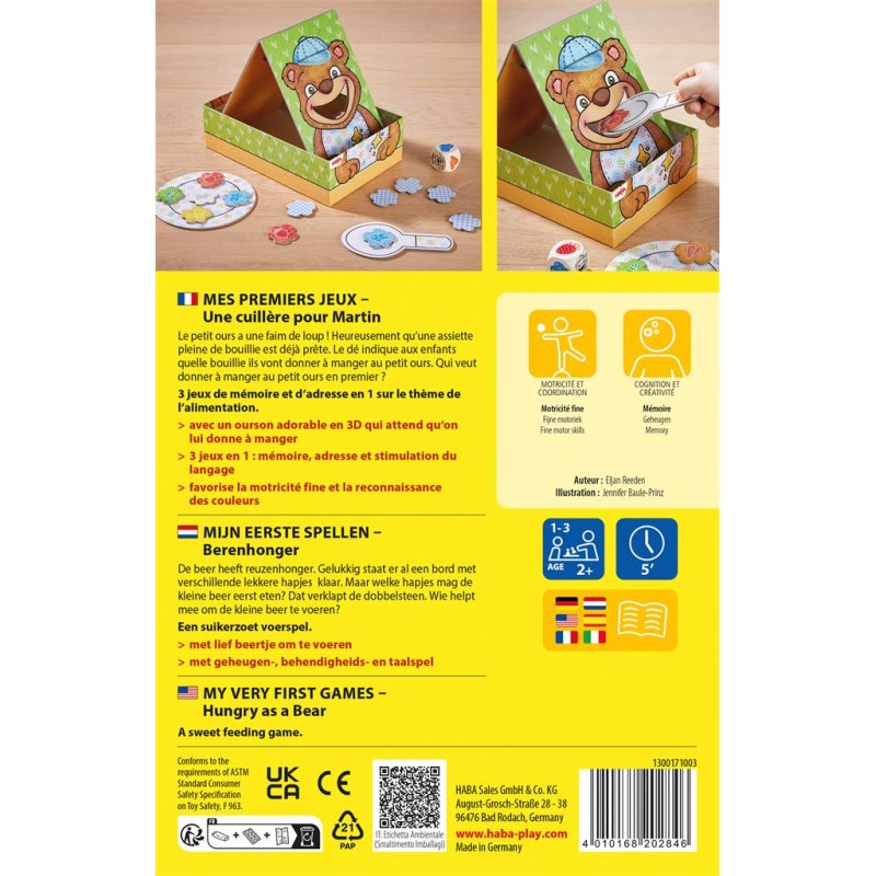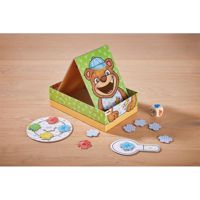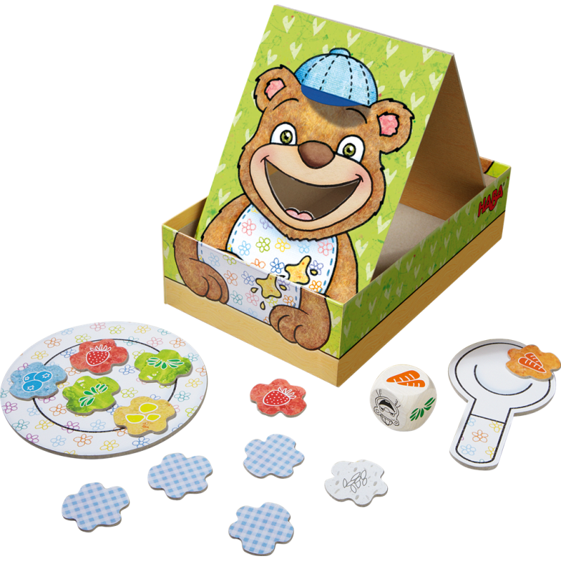 Lancez le dé et posez la tuile de l’aliment sur la cuillère puis glissez-la dans la bouche de l’ourson. À la fin de la partie, la pile des aliments qui ont bien été mangés doit être plus grande que celle des aliments tombés de la cuillère. Un jeu d’adresse coopératif.