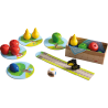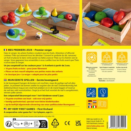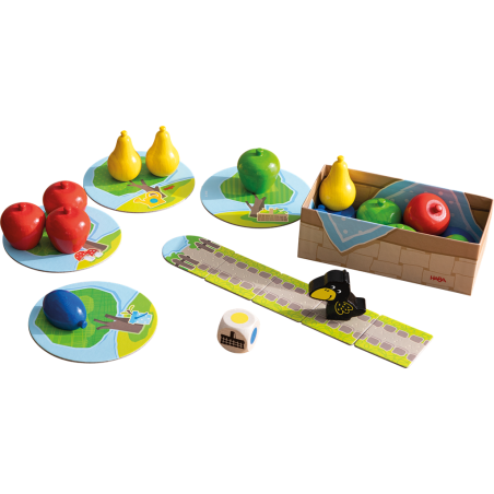 Les arbres croulent sous les fruits et le corbeau Théo aimerait tous les dérober. Lancez le dé et prenez le fruit désigné avant de le glisser dans votre panier. Si le dé indique un corbeau, Théo avance sur sa piste ! Cueillez tous les fruits avant que le cordeau n’arrive dans le verger. Sinon, tout le monde perd la partie.