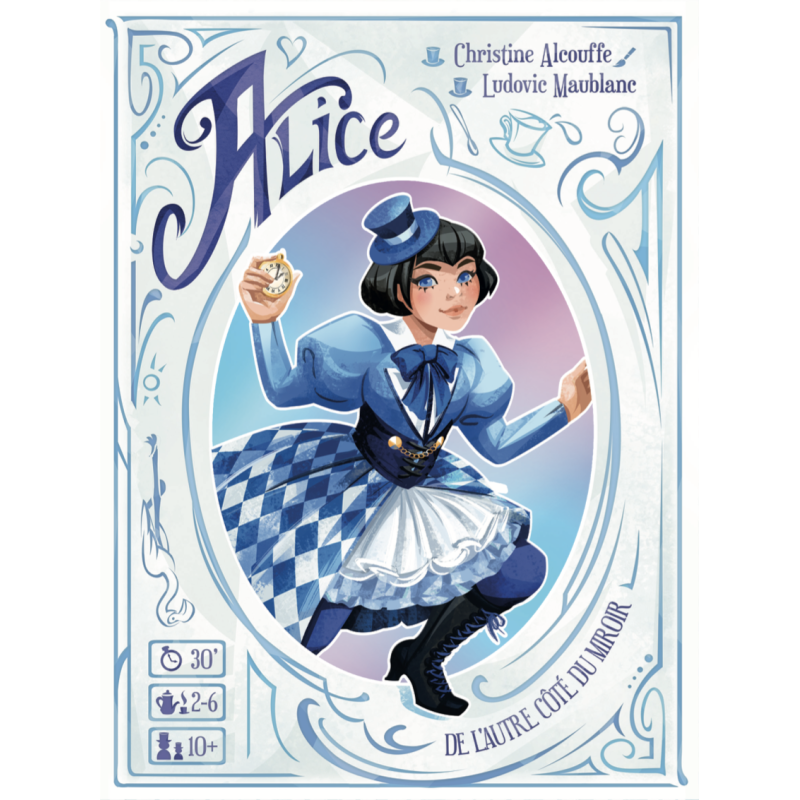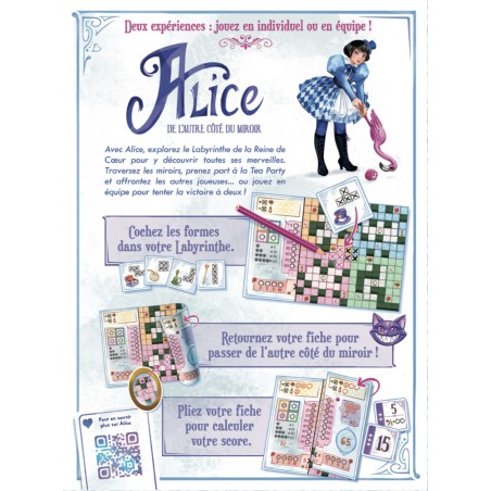 Alice est un jeu à cocher compétitif où chaque joueur doit reproduire sur sa fiche les formes révélées au centre de la table. À chaque tour, une carte Forme est retournée : tous les joueurs tracent la forme sur leur fiche en respectant des règles de placement simples mais tactiques. Certaines cases déclenchent des bonus : agrandir ou réduire une forme, marquer des points ou activer des effets. Le twist : la fiche est recto-verso, et on la retourne en cours de partie en traversant un miroir ! Un système de zones colorées et d’icônes à optimiser enrichit les choix. Un mode équipe complète l’expérience pour des parties en duo avec des objectifs asymétriques. Le scoring croisé et les multiples interactions entre les éléments rendent chaque partie vivante, fluide et maline.