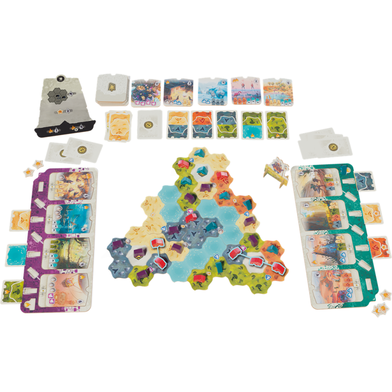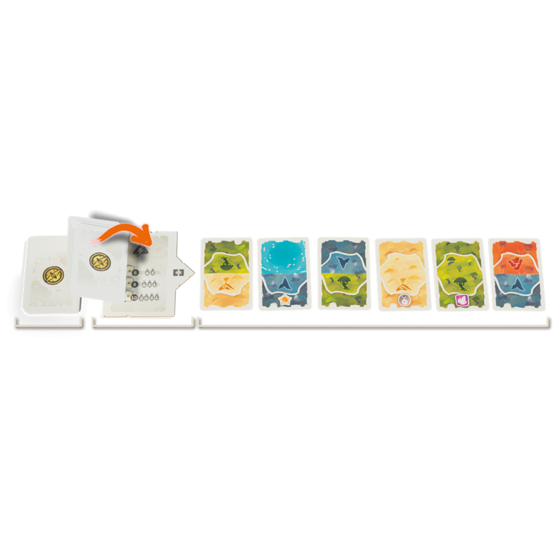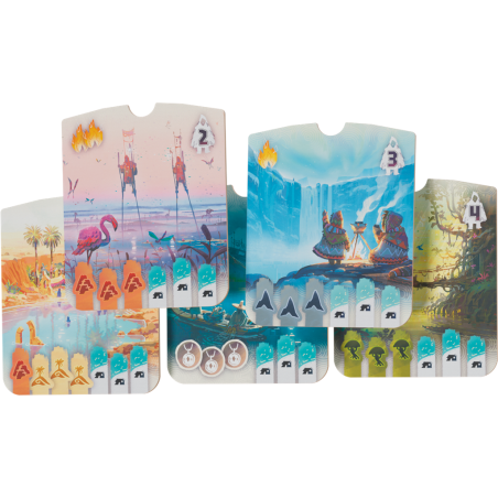Chaque tour, vous devrez choisir entre piocher de précieuses cartes Terrain ou avancer sur la carte. Le moindre mouvement compte : vos camps bloquent, connectent ou ouvrent de nouvelles voies vers la victoire. Grâce à un système de placement malin, des objectifs à valider (tuiles Histoire) pour marquer plus de points et des effets de terrain variés, chaque décision tactique impacte votre score final. En plus de la conquête de territoires, vous devrez maîtriser le feu, récolter des baies et connecter vos camps pour maximiser votre score. Tout en mettant des batons dans les roues de vos adversaires !