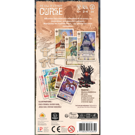 The Vale of Eternity – Curse enrichit l’expérience avec l’arrivée des Invocateurs, des personnages dotés de pouvoirs uniques qui évoluent au fil de la partie. Chaque joueur en incarne un, ajoutant une forte asymétrie et une rejouabilité renouvelée. Cette extension introduit aussi deux nouvelles dynamiques : les malédictions, qui pèsent sur vos cartes et votre score final mais peuvent être apaisées pour gagner des points, et les sceaux, une ressource précieuse à briser pour invoquer ou à réparer pour se protéger. Entre puissance corruptrice et purification, il faudra gérer vos choix pour triompher de l’influence de l’Arbre maudit.