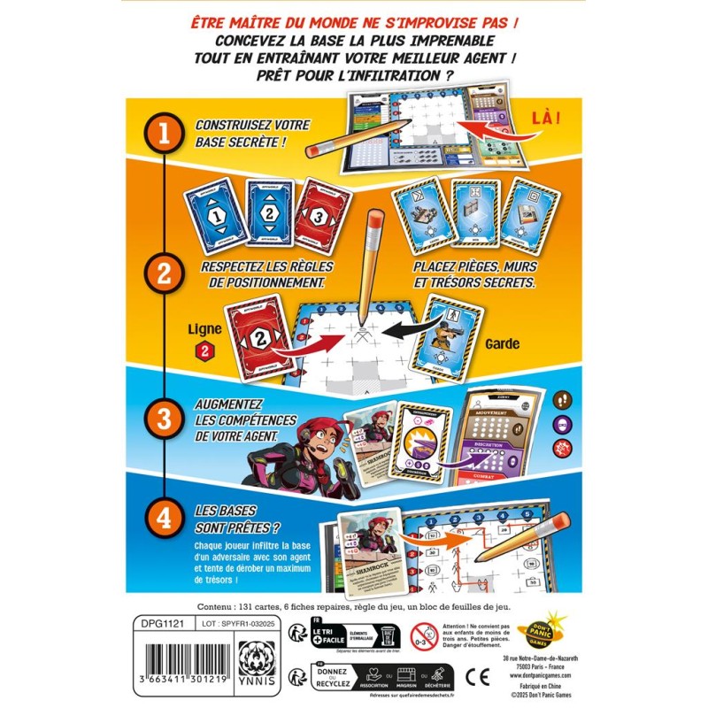 Dans ce "flip & write" malin et innovant, chacun coche et dessine sur sa feuille pour créer un labyrinthe défensif truffé de pièges, murs, gardiens et trésors secrets. Chaque tour, les joueurs choisissent simultanément des cartes pour poser un nouvel élément ou améliorer leurs compétences d’infiltration : discrétion, mouvement ou combat. Au terme de la phase de planification, chacun infiltre la base d’un autre joueur avec son agent, en gérant ses points d'entraînement et en activant ses gadgets au bon moment.