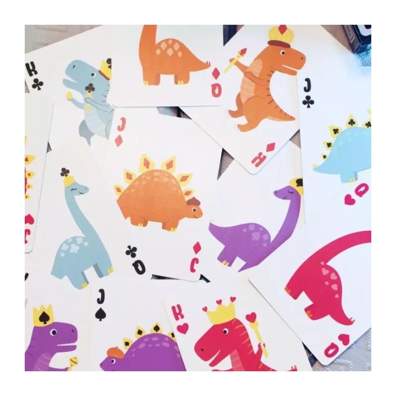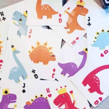 Chaque carte a été totalement réinventée dans un univers préhistorique coloré et joyeux qui fera sourire aussi bien les enfants que les adultes. Les figures sont devenues de charmants dinosaures, dans un style immédiatement accrocheur.