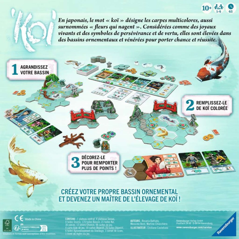 Koï est un jeu pour toute la famille où vous devrez créer un bassin pour vos Koïs et gagner le plus de point de victoires.