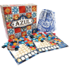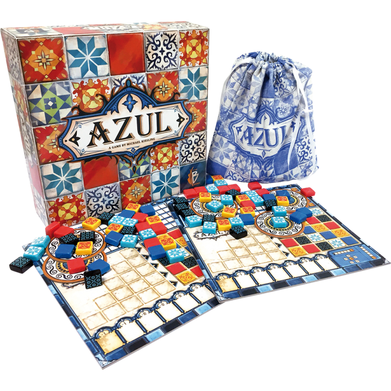 Azul vous place dans le rôle d’un chef décorateur chargé de poser des Azulejos dans le palais du roi Manuel 1er, au XVIe siècle. Chaque joueur dispose d’un plateau composé d’une piste de score, de lignes de motifs et d’un mur de palais. À chaque manche, des tuiles (il y a 5 motifs différents) sont piochées dans un sac et disposées sur des ‘fabriques’. À son tour de jeu un joueur va pouvoir prendre toutes les tuiles d’un même motif sur une fabrique et les déposer sur ses lignes de motifs. Quand une ligne est complétée par des tuiles identiques, il peut en poser une sur son mur de palais. En alignant ainsi des tuiles sur le mur du roi, on marque des points. Azul est un jeu de pose de tuiles très malin, qui sort des poncifs habituels du jeu abstrait pour offrir un jeu séduisant et dépaysant.
