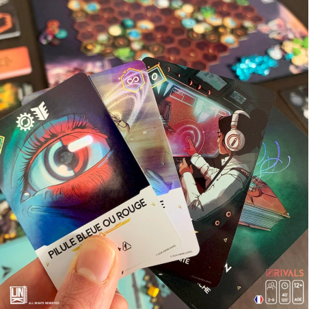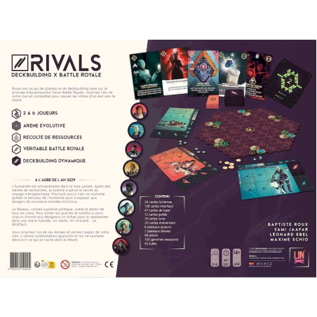 Rivals se joue en plusieurs manches, chacune découpée en deux tours de jeu. Pendant leur tour, les joueurs disposent de 2 points d’action pour se déplacer, récolter les ressources d’une tuile, jouer des cartes de leur main et interagir avec les sponsors. Suivez l’état de vos adversaires en consultant leurs plateaux. Points de vie, charge d’Ultime, Compétences disponibles, prenez ces éléments en compte pour adapter votre stratégie. Ajoutez des Compétences à votre plateau Ashak pour développer votre puissance, augmenter vos actions et votre pioche.