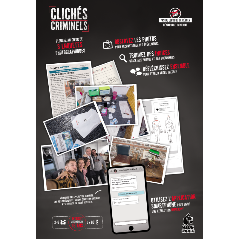 Lancez l’application, écoutez le briefing du commissaire puis laissez votre smartphone de côté : ouvrez l’enveloppe de l’affaire que vous souhaitez jouer, observez les photos de la scène de crime, parcourez les documents fournis par la police et coopérez pour établir votre théorie. Une fois satisfaits par vos réflexions, revenez sur l’application pour échanger avec la commissaire et éprouver votre théorie.