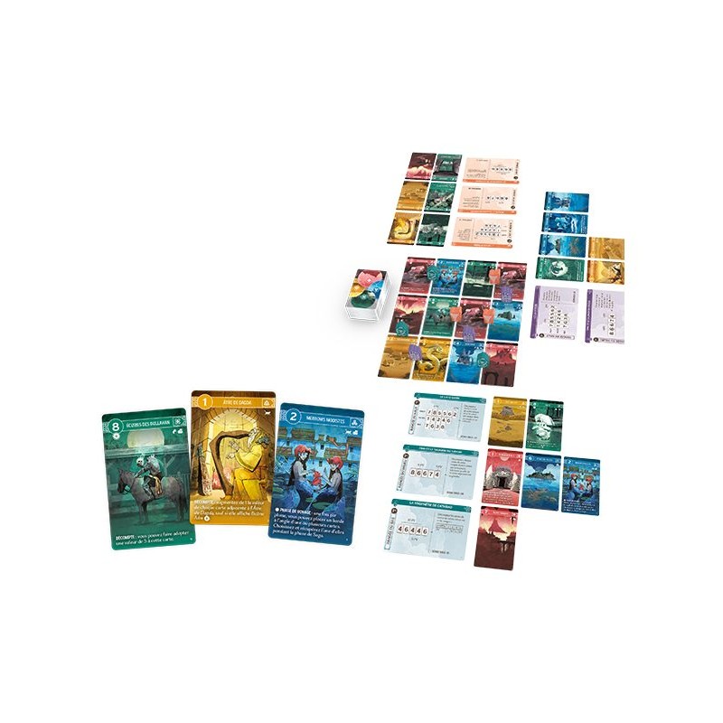 Placez vos bardes entre les cartes d’histoires dans une grille partagée. Lorsque tous sont placés, dans l’ordre inverse du tour, “draftez” les cartes. Depuis votre main, jouez-les sur votre tableau personnel. En fin de partie, marquez vos points dans chaque saga et suivant les cartes de même couleur connectées ! Interactions, réflexions et décisions permanentes.