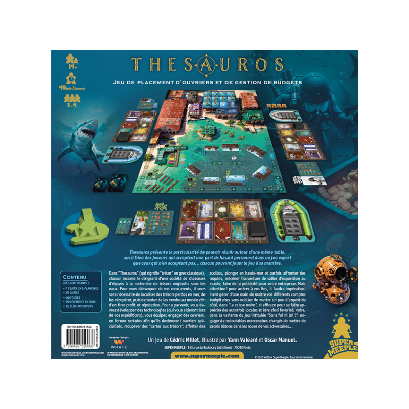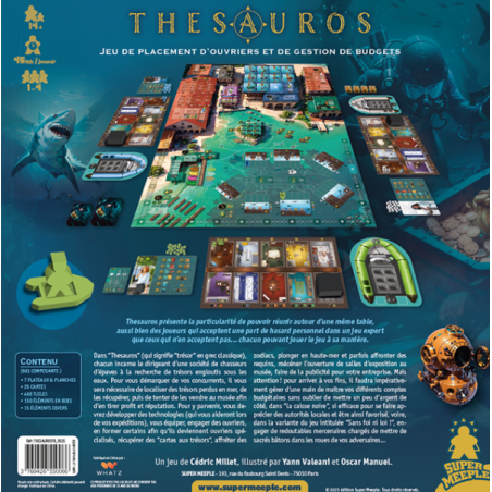 Dans ”Thesauros” (qui signifie ”trésor” en grec classique), chacun incarne le dirigeant d’une société de chasseurs d’épaves à la recherche de trésors engloutis sous les eaux. Pour vous démarquer de vos concurrents, il vous sera nécessaire de localiser des trésors perdus en mer, de les récupérer puis de tenter de les vendre au musée afin d’en tirer profit et réputation.