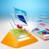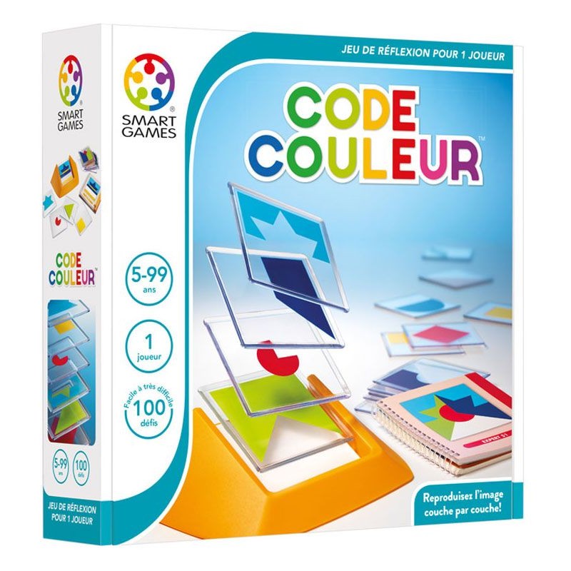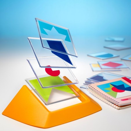 Un défi est à choisir parmi les 100 proposés. Apparaît une figure à reconstituer à partir des 18 plaquettes transparentes à superposer. Grâce aux couleurs visibles sur la figure, le joueur peut sélectionner les plaquettes à utiliser, sachant qu'elle sont toutes monochromes et que seules 2 d'entre elles contiennent la même couleur. Mais une fois les plaquettes de couleur identifiées, il faudra encore trouver dans quel sens positionner chaque forme et dans quel ordre placer ces différentes images pour reproduire la figure demandée. 4 niveaux de difficulté évolutifs sont proposés, avec un nombre croissant de plaquettes nécessaires : 2 images au niveau Starter, puis 1 supplémentaire par niveau, pour atteindre 5 en Master. Le nombre de combinaisons possibles ne fait donc qu'augmenter, pour pimenter le jeu et satisfaire tous les âges.