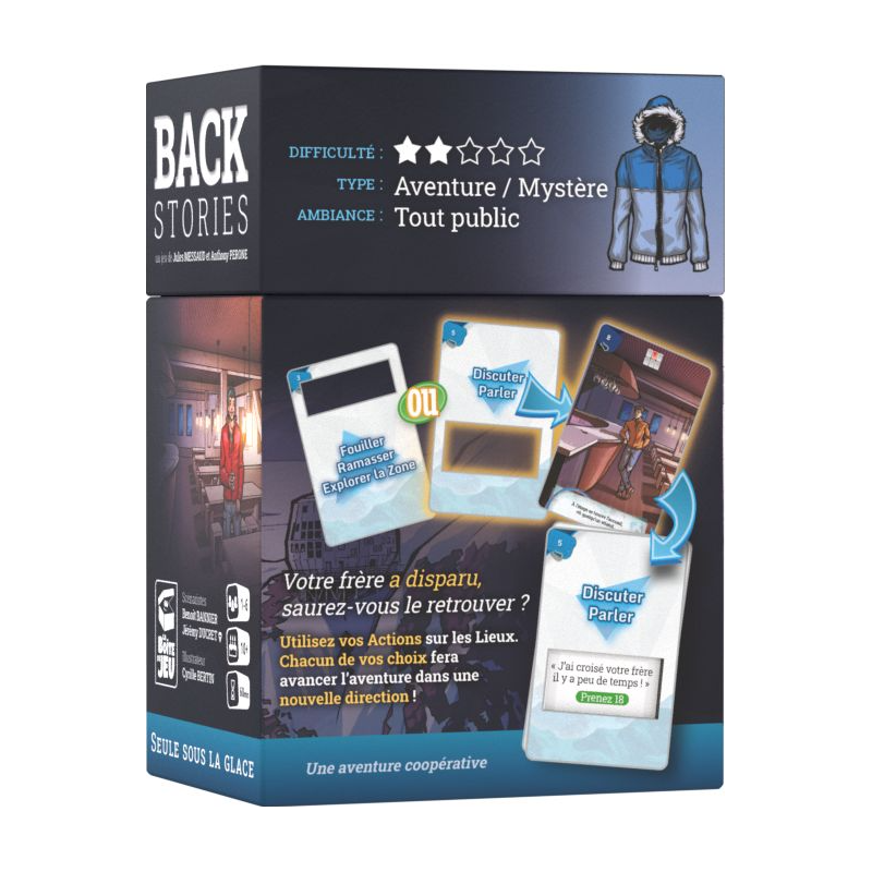 Backstories est un jeu d'aventure qui fonctionne à la manière d'un "point & click". Choisissez une action (Fouiller, Discuter, Explorer, etc ...) sur un lieu, et révélez les conséquences de votre choix grâce à un astucieux système de cartes perforées. Plusieurs fins sont possibles : Vos choix, VOTRE aventure !