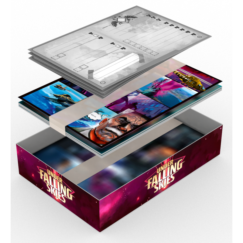Le vaisseau mère largue ses impitoyables chasseurs alors que l’humanité tout entière se réfugie dans des abris souterrains pour organiser la riposte. L’enjeu ? Gagner assez de temps pour développer une arme assez puissante pour repousser les envahisseurs. Parviendrez-vous à sauver la planète ? Seul contre la menace alien Under Falling Skies est un jeu solo qui invite le joueur à incarner la défense terrienne contre l’attaque extraterrestre. À chaque tour de jeu, le vaisseau ennemi va s’approcher de la planète et la partie sera perdue s’il parvient à se poser.