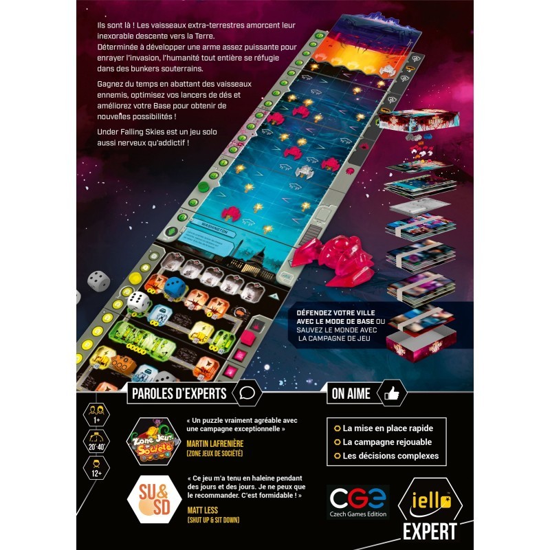 À ce titre, Under Falling Skies rejoint la gamme IELLO EXPERT, pour sa profondeur de jeu. Les parties s’enchainent volontiers et la progression du joueur est de plus en plus déterminante alors qu’il comprend les enjeux de chaque placement de dé. Un contenu pléthorique Under Falling Skies est un concentré de bonnes idées qui rend les parties totalement addictives. Chaque défaite appelle à une revanche, chaque victoire donne envie de faire mieux encore. Si la version Print & Play publiée d’Under Falling Skies a permis de le découvrir et d’asseoir sa popularité : cette version boîte propose un contenu considérablement enrichi ! Avec ses nouvelles villes, nouvelles tuiles, personnages améliorables, mode campagne et scénarios, cette édition d’Under Falling Skies propose une intensité stratégique inédite pour un challenge à la mesure des joueurs les plus exigeants.