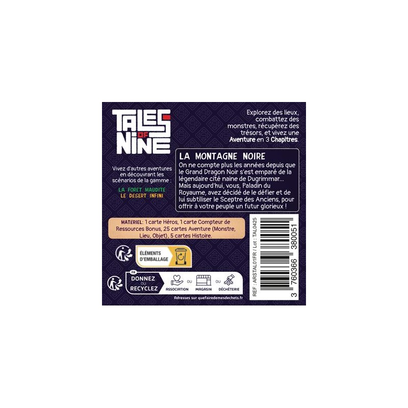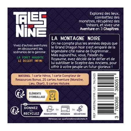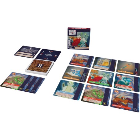 Chaque boîte de Tales of Nine contient 3 chapitres d’une histoire à découvrir sous forme de cartes. Huit d’entre elles sont placées autour de la carte Héros, formant la région ou le donjon à explorer. Déplacez votre héros en utilisant son mouvement de base ou une carte précédemment acquise. Affrontez les monstres en dépensant les ressources nécessaires et venez à bout de chaque chapitre en accumulant des trésors et en visitant les différents lieux.