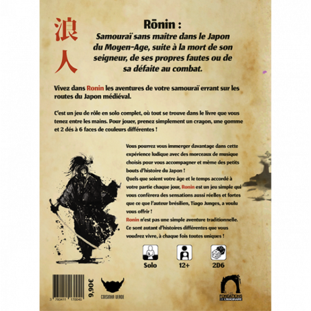 Ronin est un jeu de rôle en solitaire au format A5 de 32 pages dans lequel vous écrivez l’histoire d’un vagabond en quête de rédemption dans le Japon du Moyen-Age.