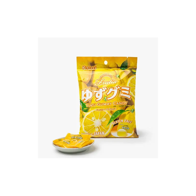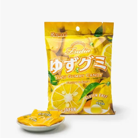 Sirop d'amidon, sucre, gélatine (E441), jus de yuzu, sucre en poudre, sorbitol (E420), acidulant (acide citrique), gélifiant (E440), arôme, colorant (E160a), agent d'enrobage (E904), émulsifiant [lécithine (SOJA)].